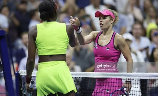 NEW YORK, NEW YORK - AUGUST 28: Laura Siegemund (R) of Germany shakes hands with Coco Gauff of the United States following their Women's Singles First Round match on Day One of the 2023 US Open at the USTA Billie Jean King National Tennis Center on August 28, 2023 in the Flushing neighborhood of the Queens borough of New York City.